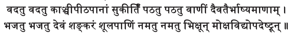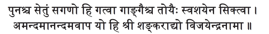May it proclaim again and again the auspicious fame of the Kanchi Peethadhipati, recited in the language spoken by Devatas (Samskritam), worship Deva Shankara, the wielder of Trishula, adore the saint, who teaches the science of Liberation (Mokshavidya).