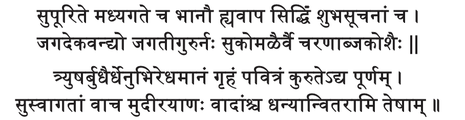 The Guru has today arrived with steps of his very gentle lotus feet, making this place pure, already rendered prosperous by three young calves. Delivering this welcome address, I express my sincere gratefulness to the Guru.