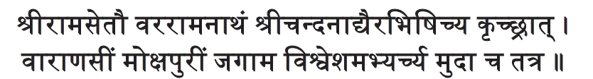 After performing Abhisheka of the celebrated Shri Ramanathaswamy with sandalwater etc. with great austerity, the Sadguru arrived at Varanasi, the Mokshapuri (city of Liberation) and joyfully worshipped Shri Vishweshwara.