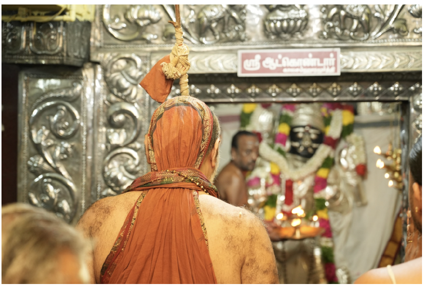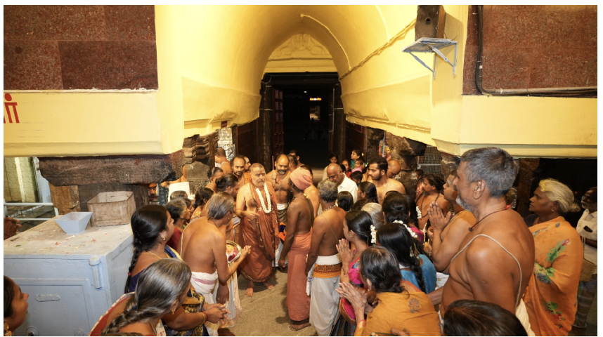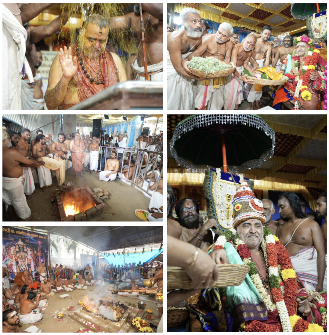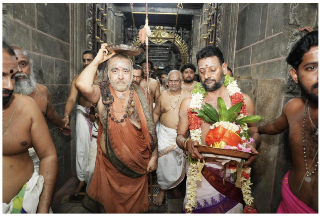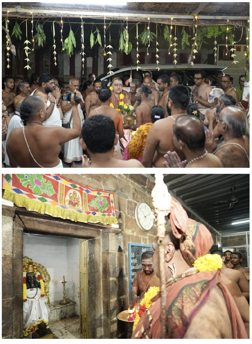 Pujya Acharya Swamiji visited the Sri Dharmasamvardhini sametha Sri Panchandeeswara temple in Tiruvaiyaru, where he participated in the ongoing Mandalabhishekam rituals. This coincided with Revathi Nakshatram and followed the completion of the Kumbabhishekam ceremony earlier this month on the last Revati Nakshatram.
