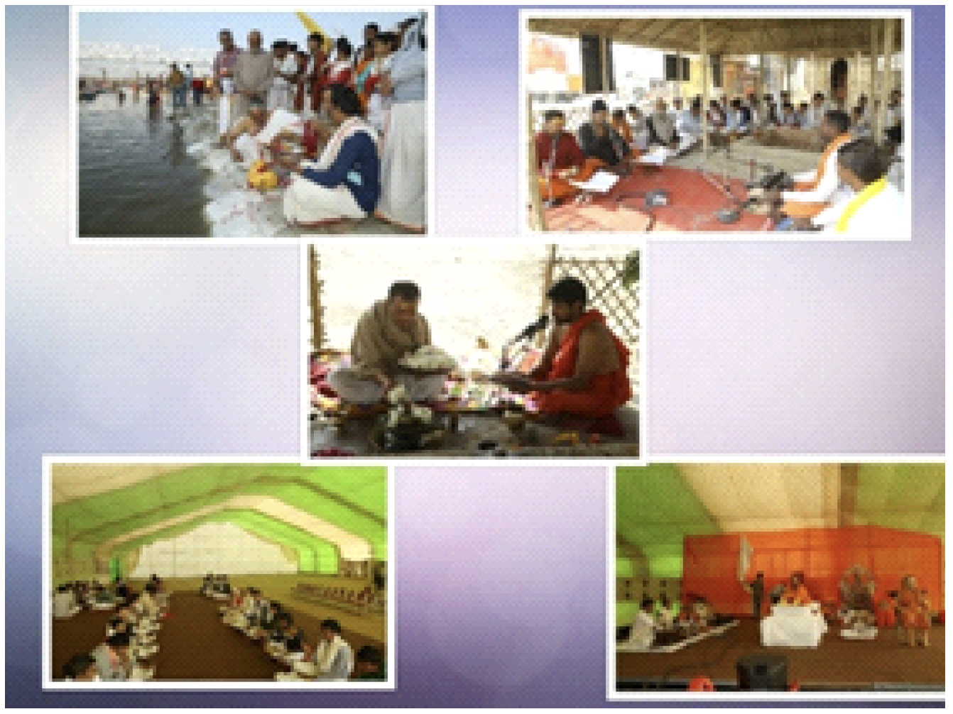 Praying for welfare of one & all, Veda Parayanam by Chitrakoot, Lucknow, Kashi & Ayodhya Pathashalas run by Kanchi Math, Special Shanmata Havans by Vaidika team from Chennai, Rigveda Havan by Scholars from Mumbai & Chennai, Rudra Havan & Durga Havan, Samuhika Stotra Parayanam by more than 100 Kamakoti Adhyapika (women), Durga Saptashati Yagnya, Annadana, Bhagavath Pravachan by Swami Govind Dev Giriji Maharaj were held at Shri Kanchi Math tent continuously for the entire Kumbh Mela period. Sri Kanchi Kamakoti Peetam, Kanchipuram, organized religious and cultural programmes at the Mahakumbh including Veda Parayanam, Havans, Bhagavat Katha, spiritual discourses, bhajans, Surya Namaskar, and pujas. Cultural events like Sangeeta Samarpan and Bhajan-kirtans were also held. A large number of pilgrims attended and participated in these sacred celebrations.