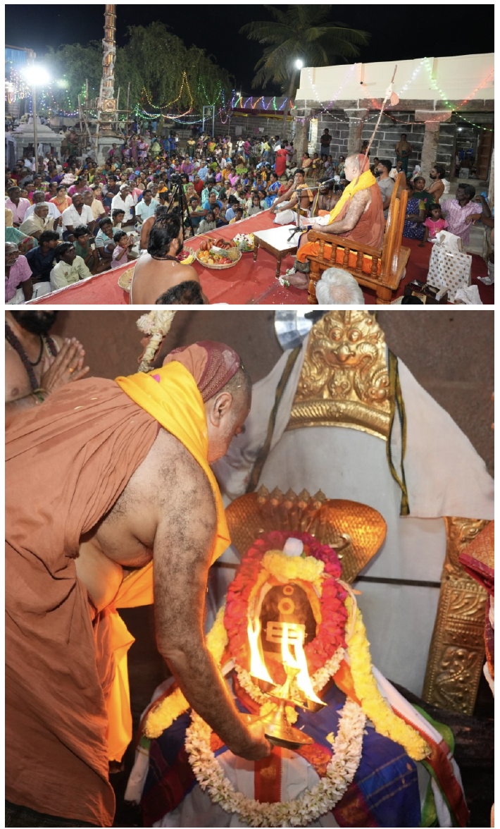 Pujyasri Acharya Swamiji visited Sri Jambunatheswarar Temple in Jambai, Villupuram District, and blessed the Yagashala pujas conducted as part of the Kumbhabhisheka Mahotsavam. Following visesha pujas at various sannidhis, Pujyasri Acharya Swamiji delivered Anugraha Bhashanam, blessing the gathered devotees.