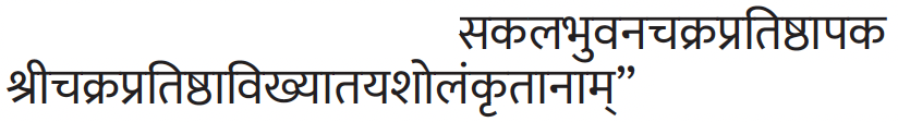 (who is decorated with the fame from installation of Shrichakra, which bestows stability to all the chakras of worlds) has adorned from ancient times the Birudaaavali of Shri Acharya.