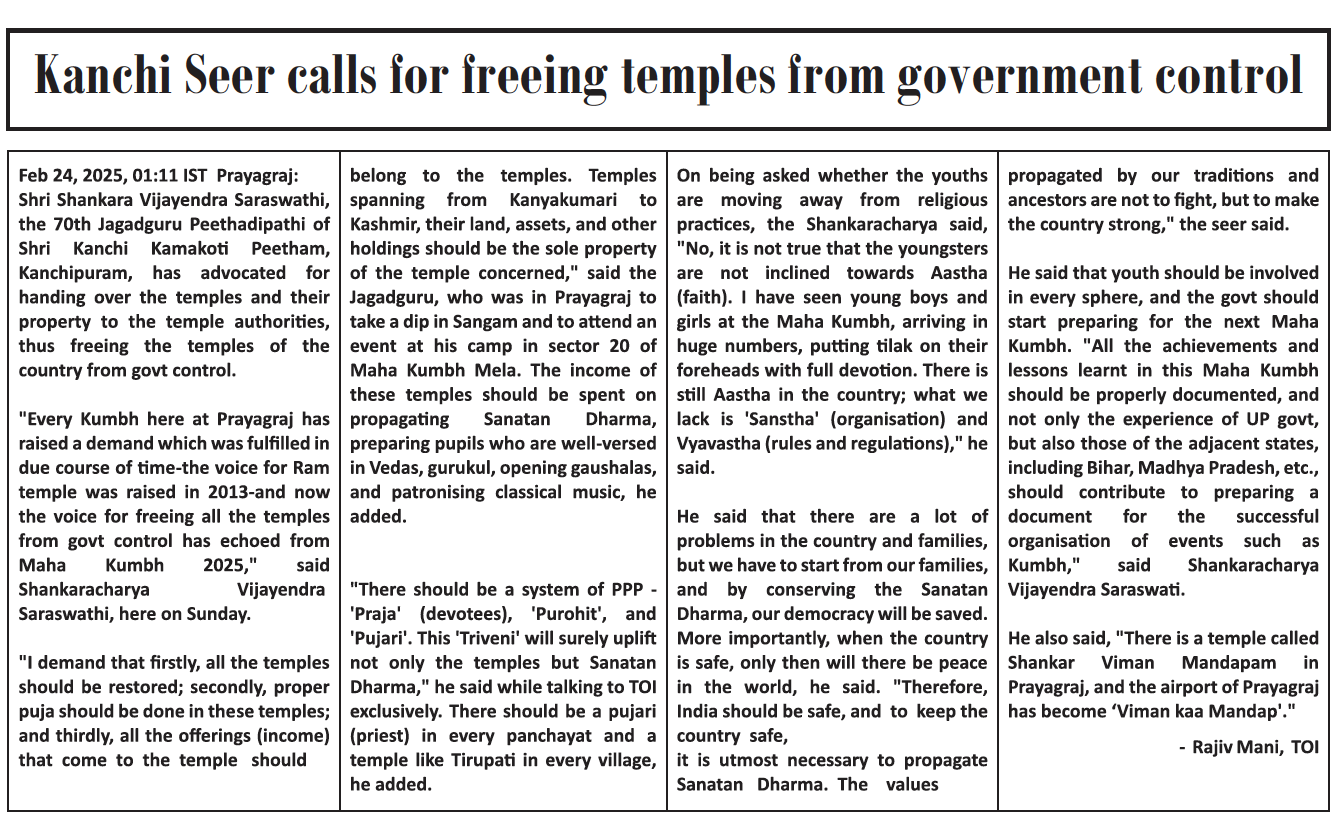 My recent trip to the Prayag Kumbh along with the Shankaracharya of Kanchi Kamakoti Peetham was a revelation of sorts. The Shankaracharya donned a devotee’s hat to chant the Ganga Stuti, Dashahara Stotra, Kashi Panchakam, Gangavataranam (as in the Ramayana and Bhagavata), Triveni Mahatmyam, Prayag Kshetra Mahatmya and Yamunashtakam. The seer also explained their significance before undertaking the holy snan preceded by a sankalp or resolution for global wellness and Bharat’s enduring prosperity. The ritual of the Ma Ganga puja followed by special oblations to gods and Vedic pundits was a divine performance to watch.